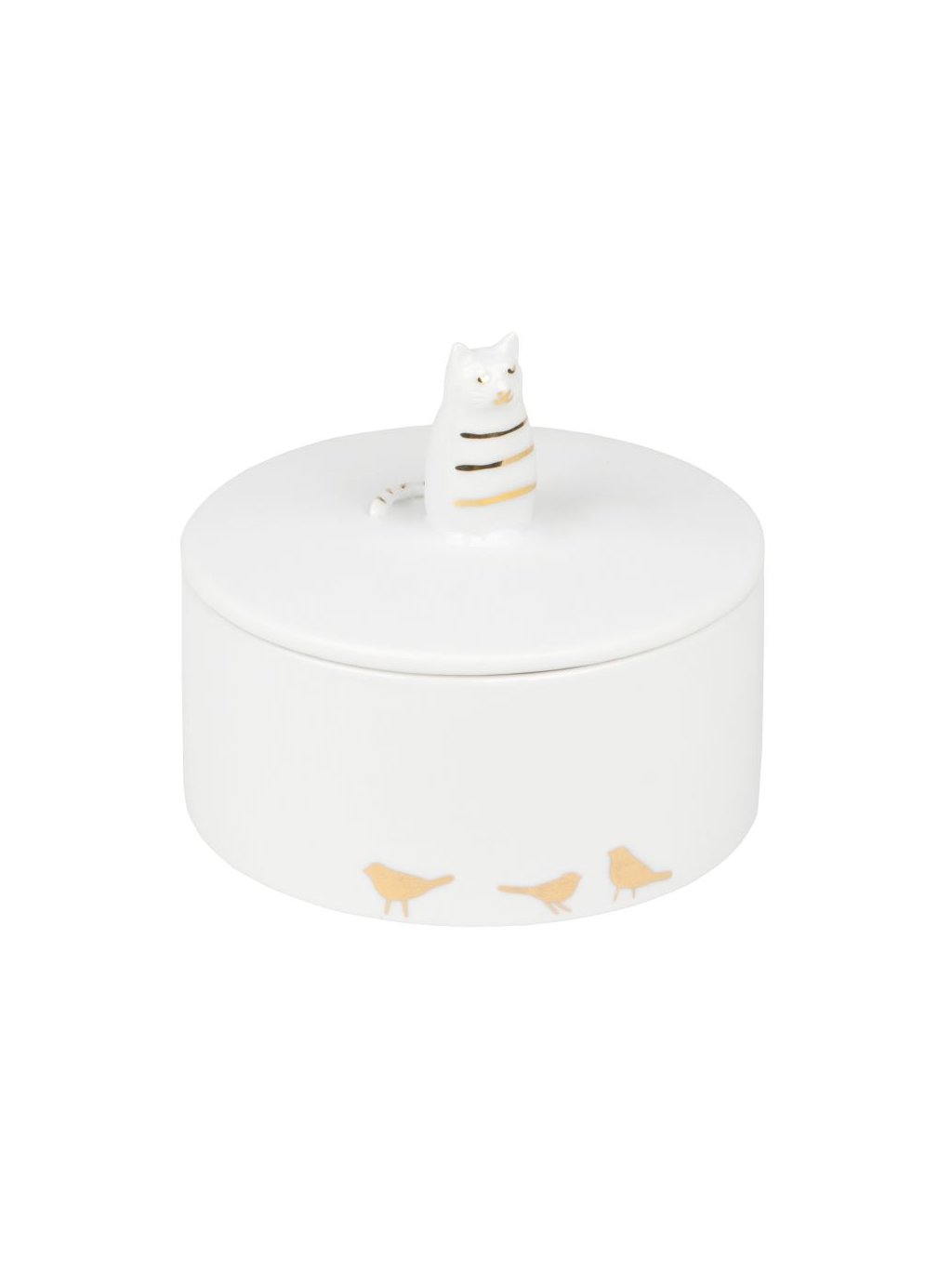 Víčko zdobí sedící kočička, bok dózy oživují zlatí ptáčci