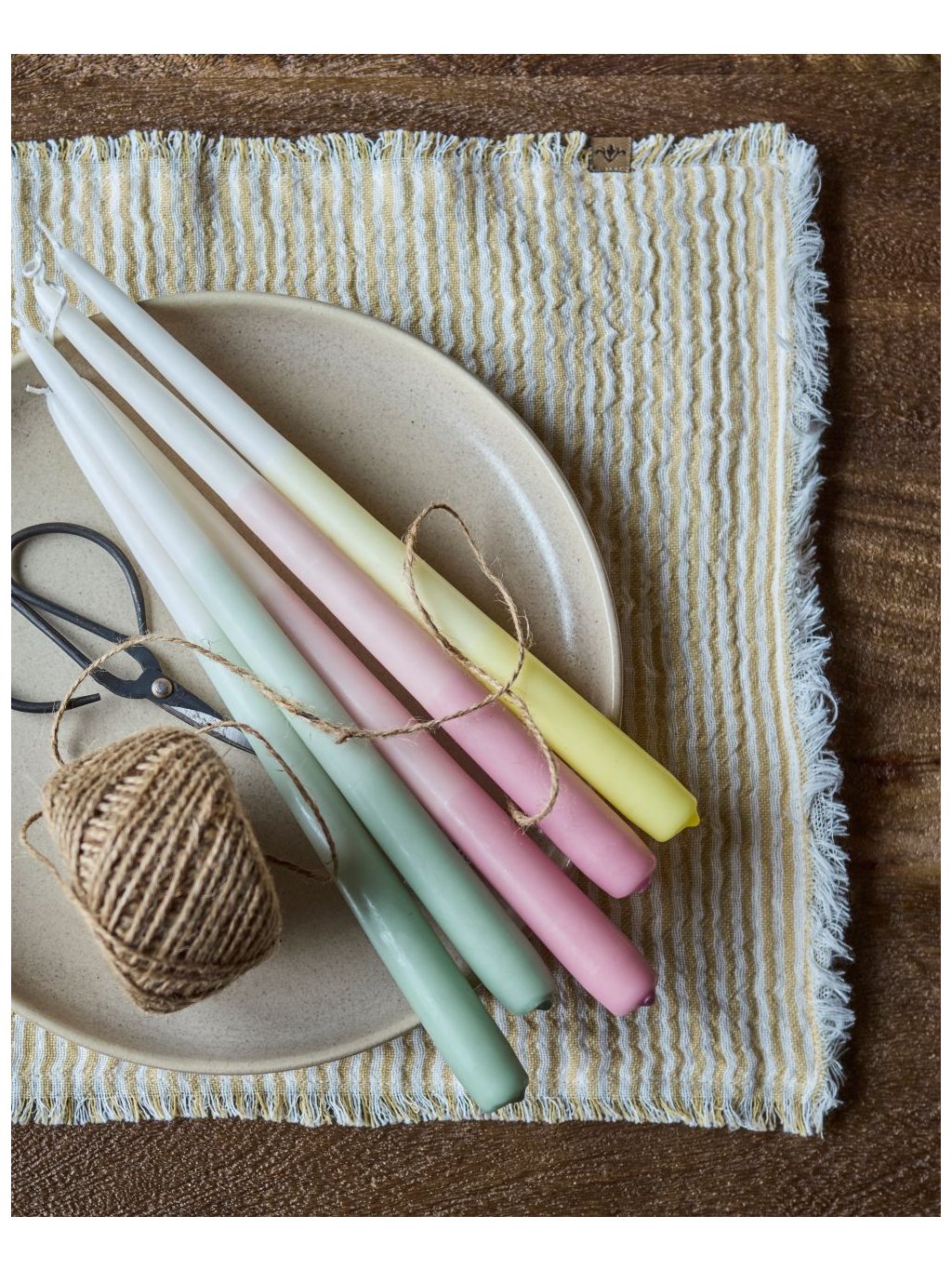 Elegantní dvoubarevné svíce s jemným přechodem do teplého žlutého tónu. Ideální pro jarní a letní stolování nebo pro rozjasnění neutrálního interiéru.
