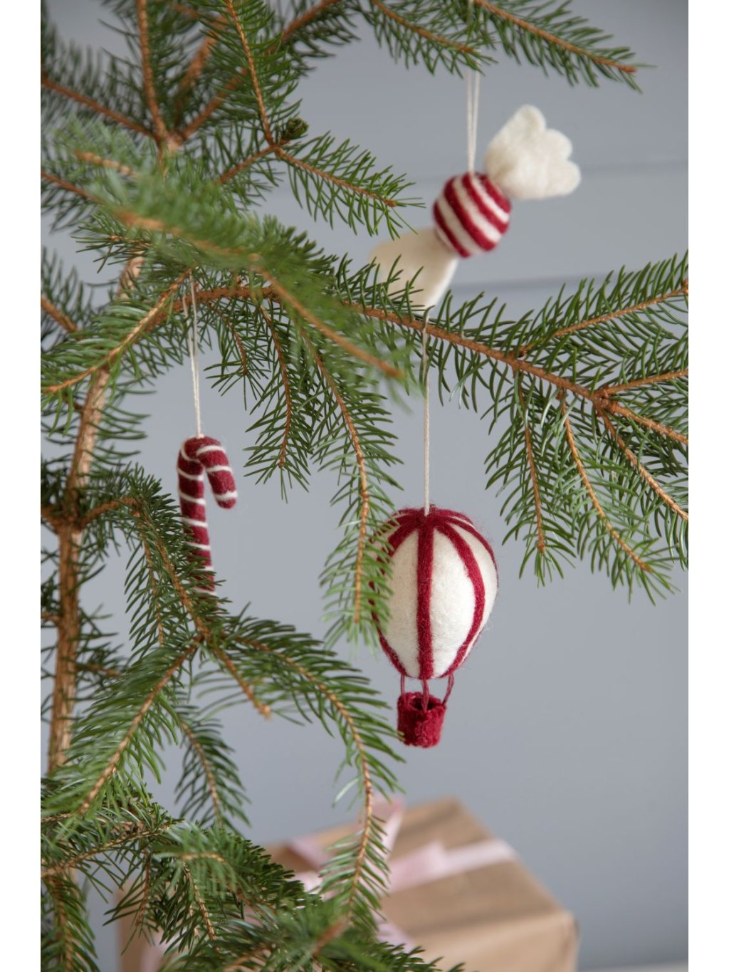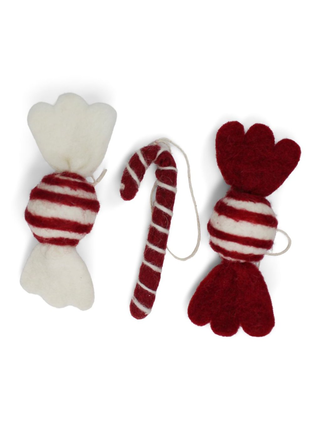Plstěné vánoční ozdoby sladkosti – červenobílé cukrovinky a lízátko