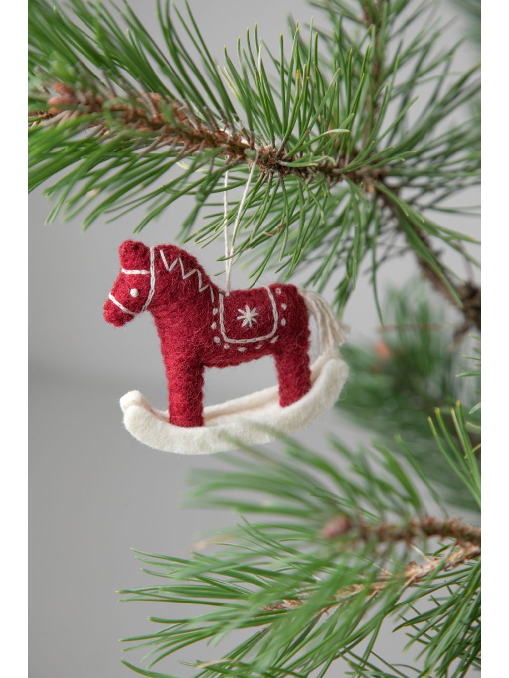 ručně vyráběná plstěná ozdoba ve tvaru houpacího koníka