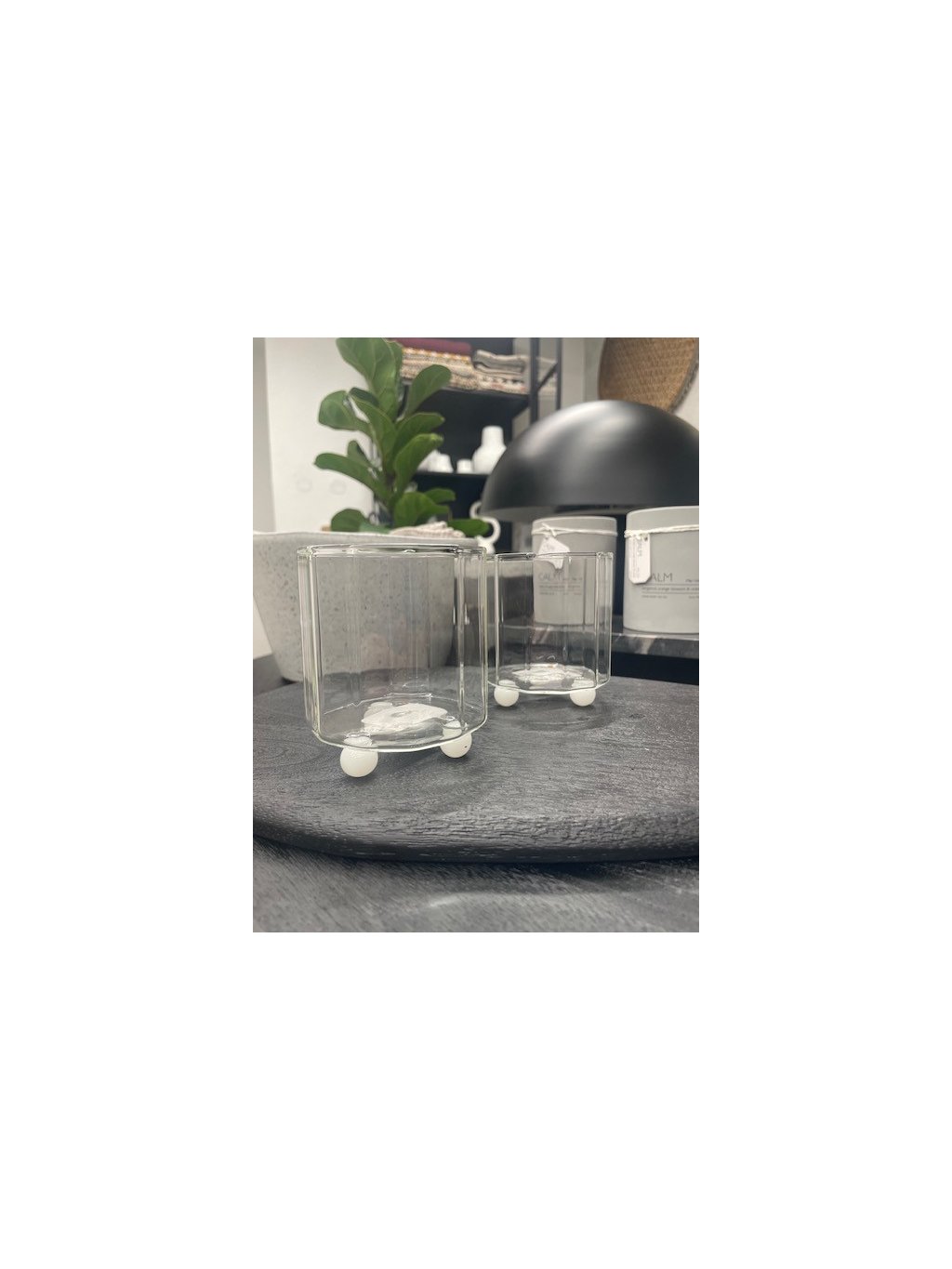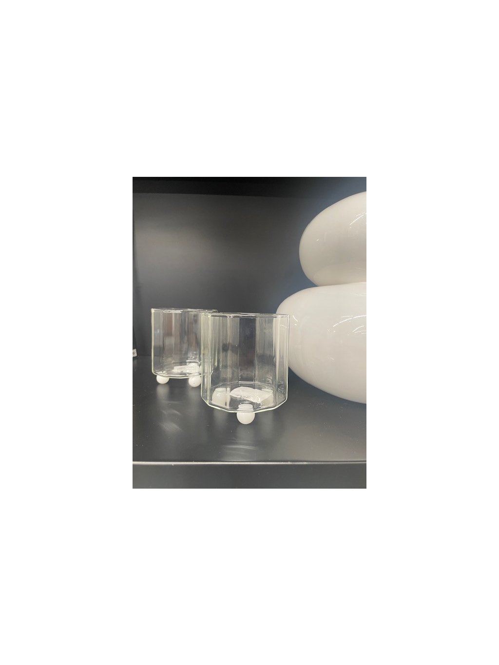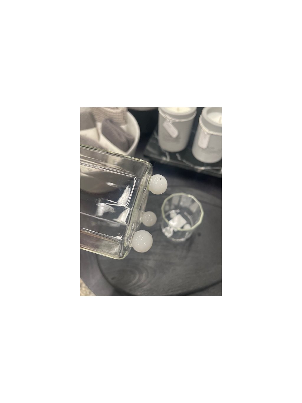 - Stabilní kuličkové nožičky: Tři bílé kuličky slouží jako elegantní nožičky, které zajišťují stabilitu sklenice a dodávají jí jedinečný vzhled.