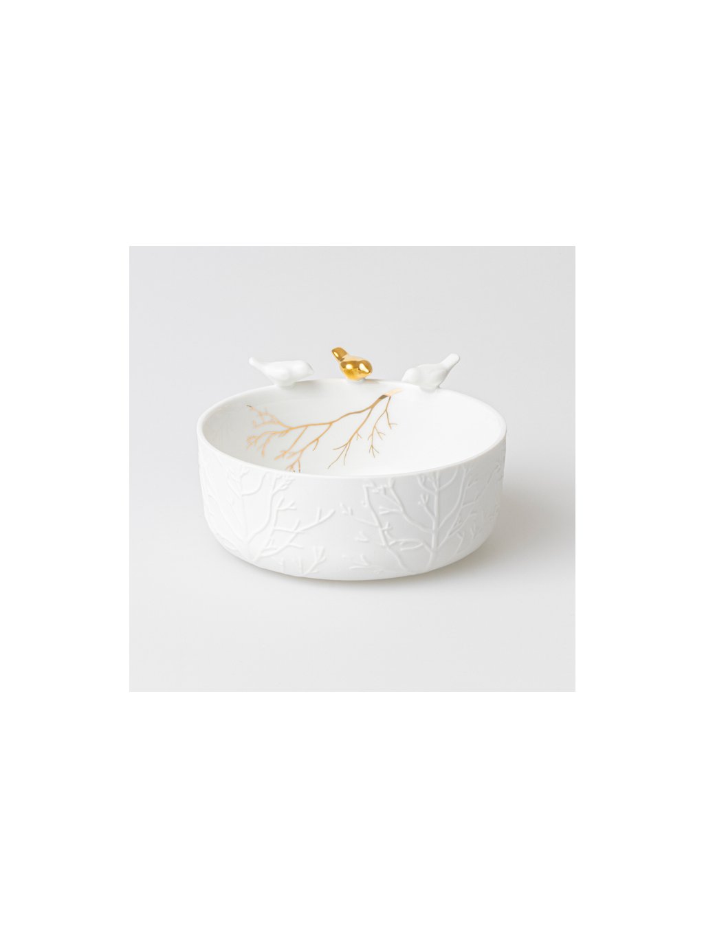 tři porcelánoví ptáčci na okraji, z nichž jeden je zdobený zlatou glazurou