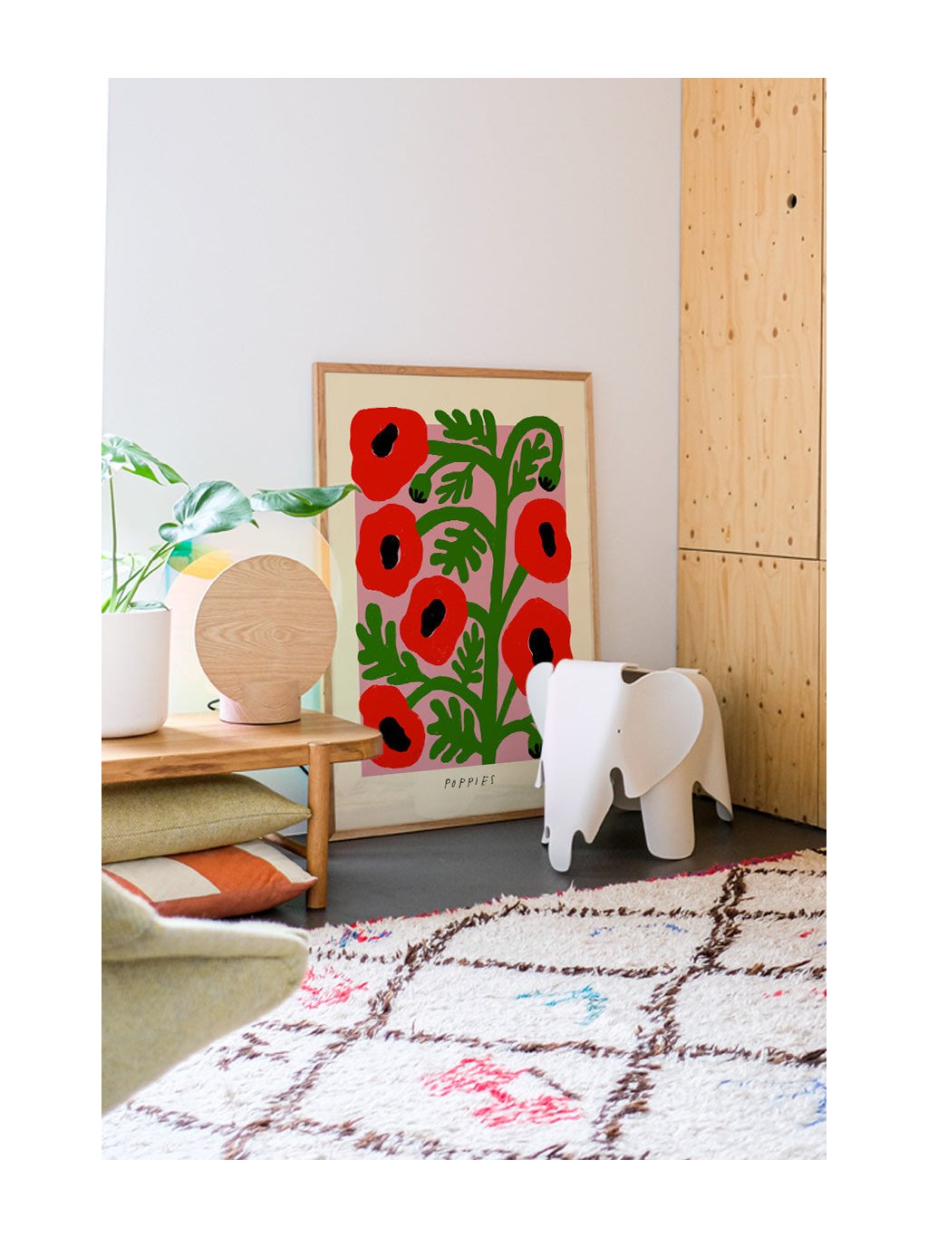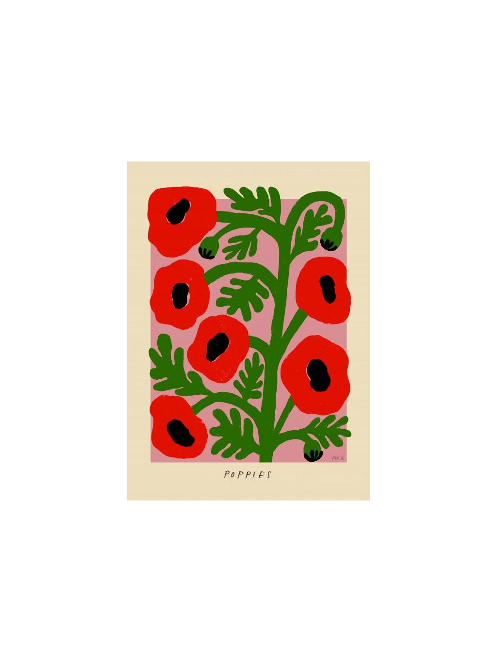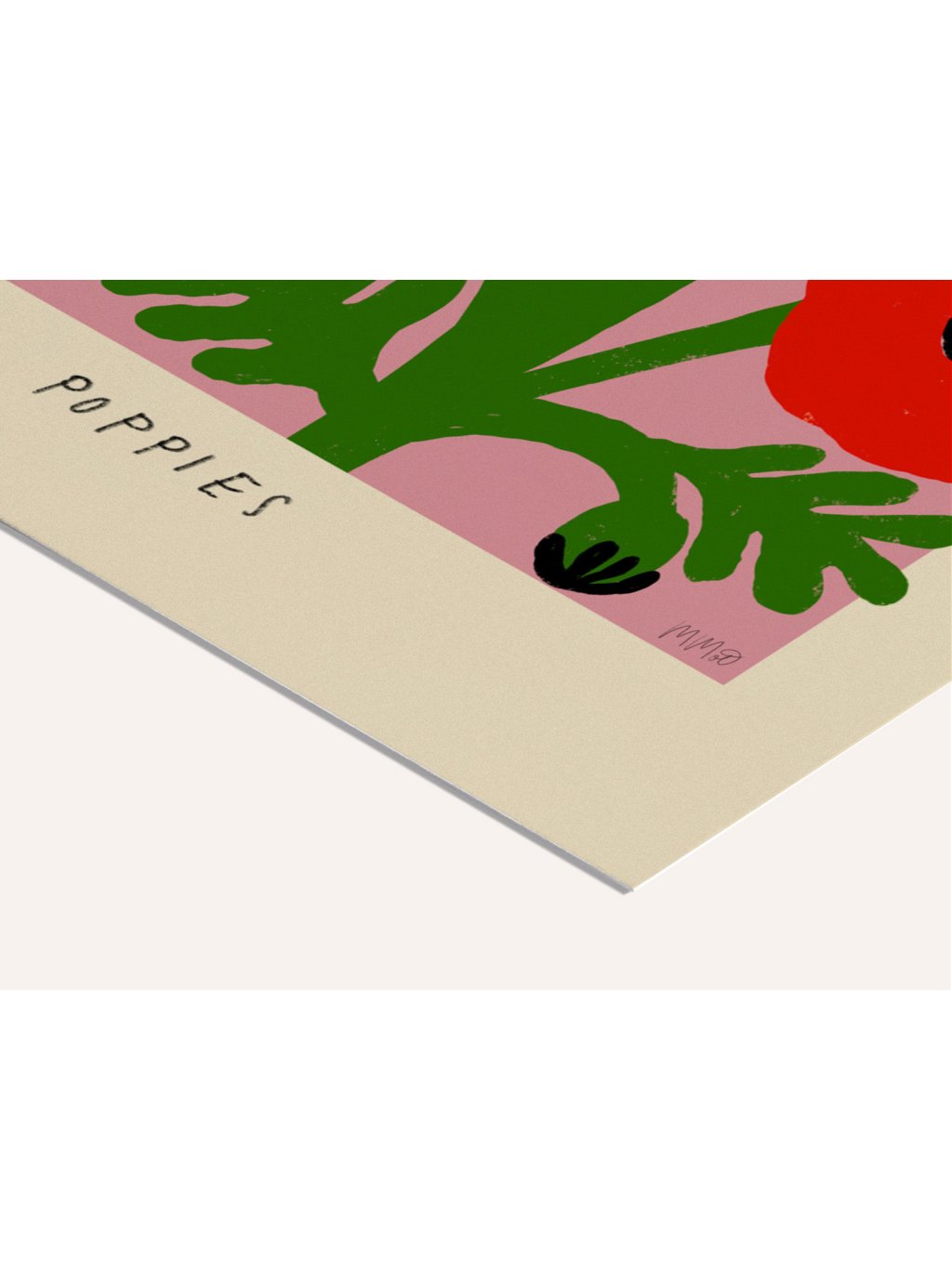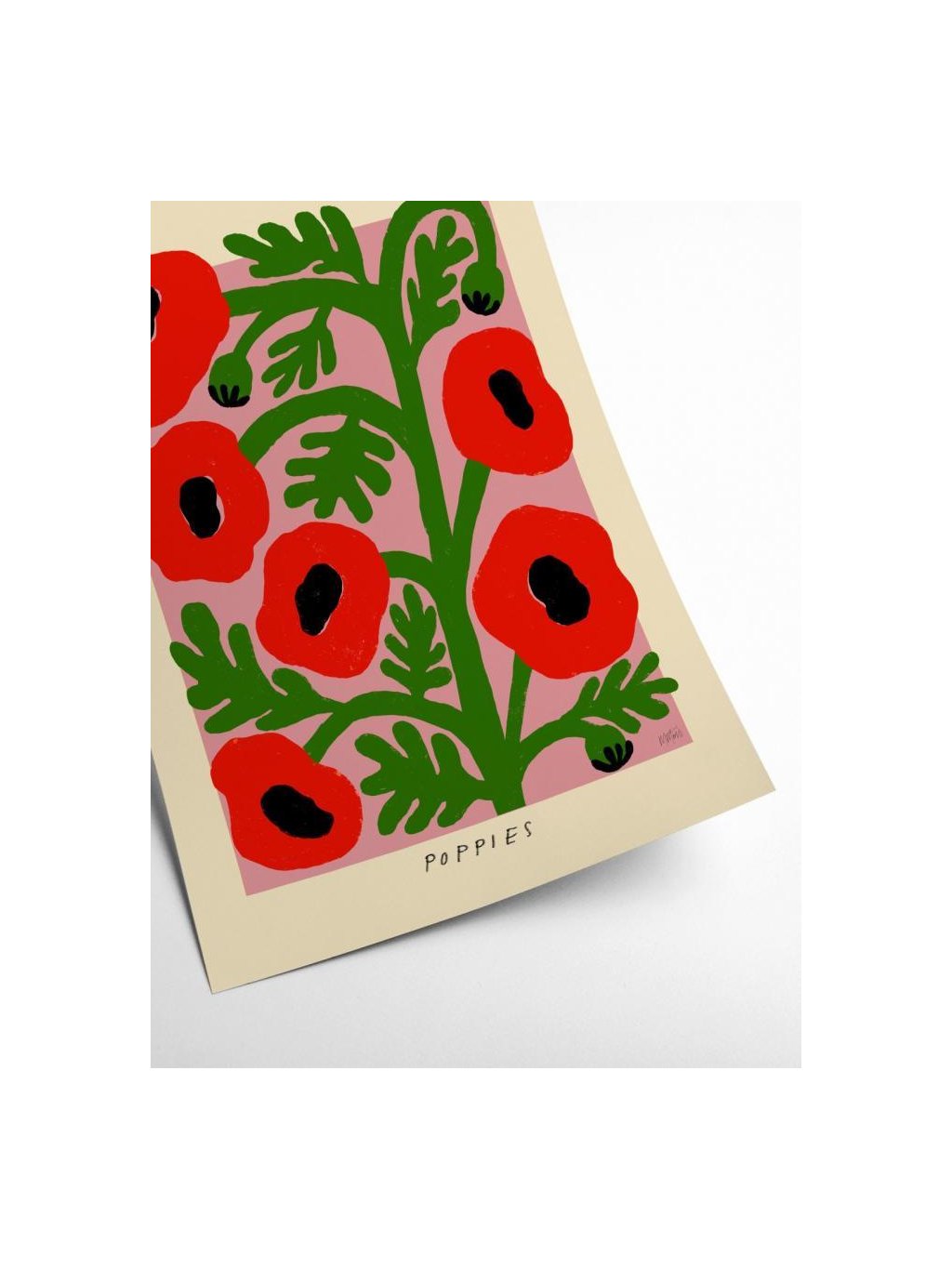 - Výrazný motiv červených máků s kontrastní zelení na růžovém pozadí.