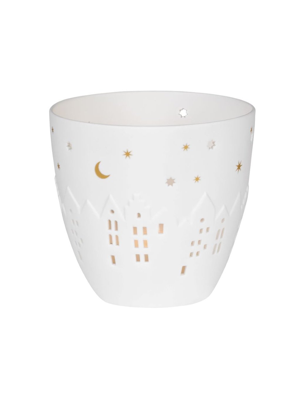 - Perforovaný motiv města, který vytváří okouzlující světelné efekty.