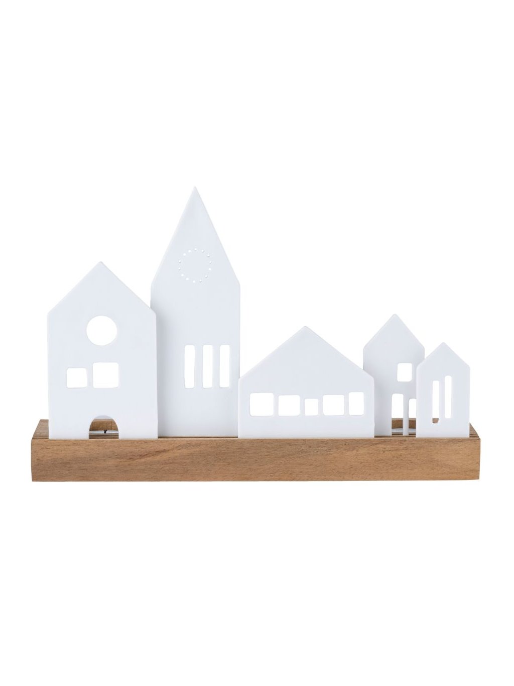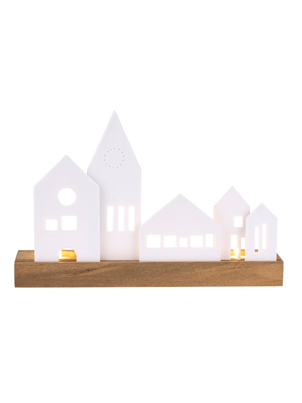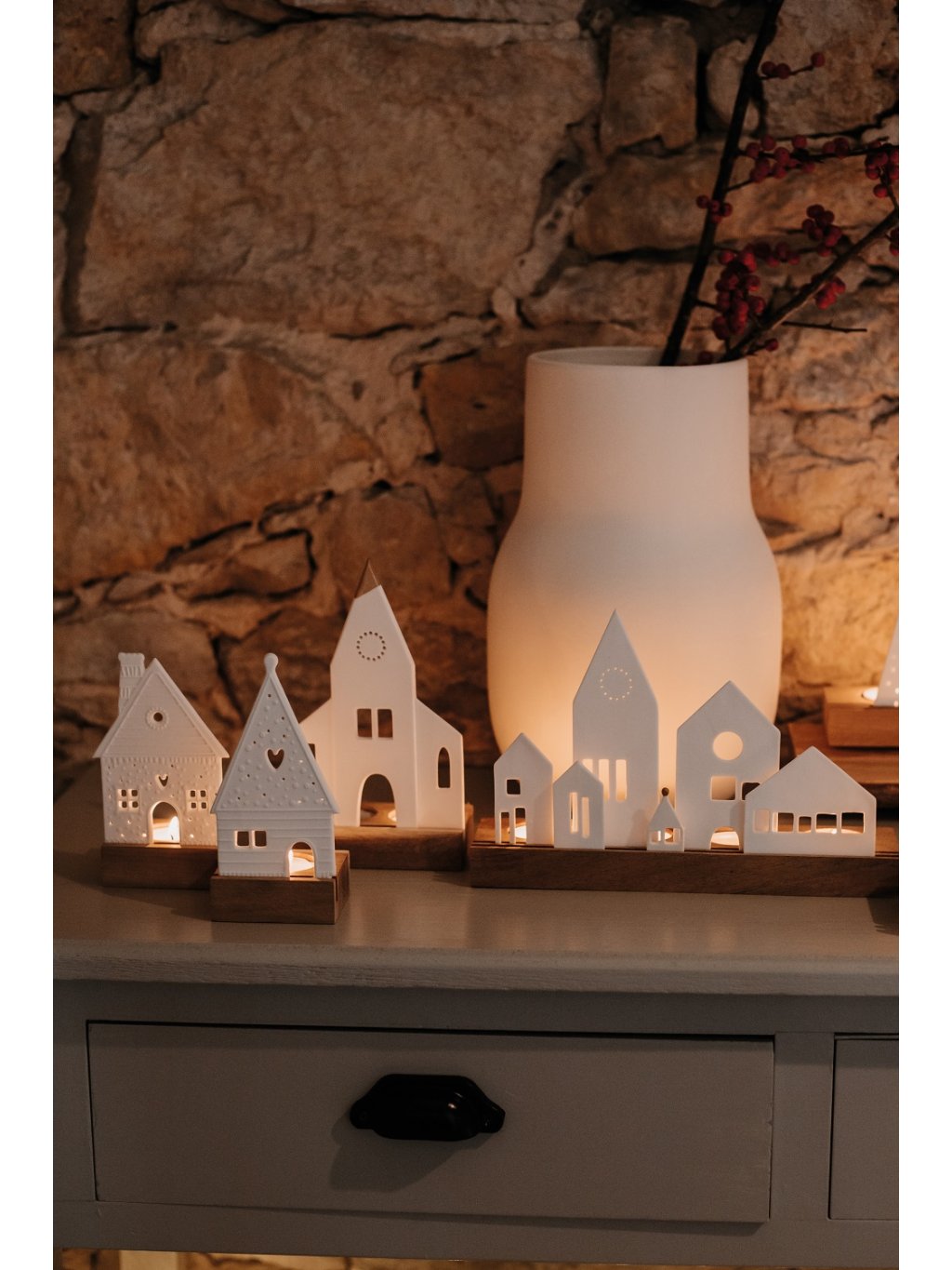 elegantní dekorace z bílého porcelánu a přírodního dřeva
