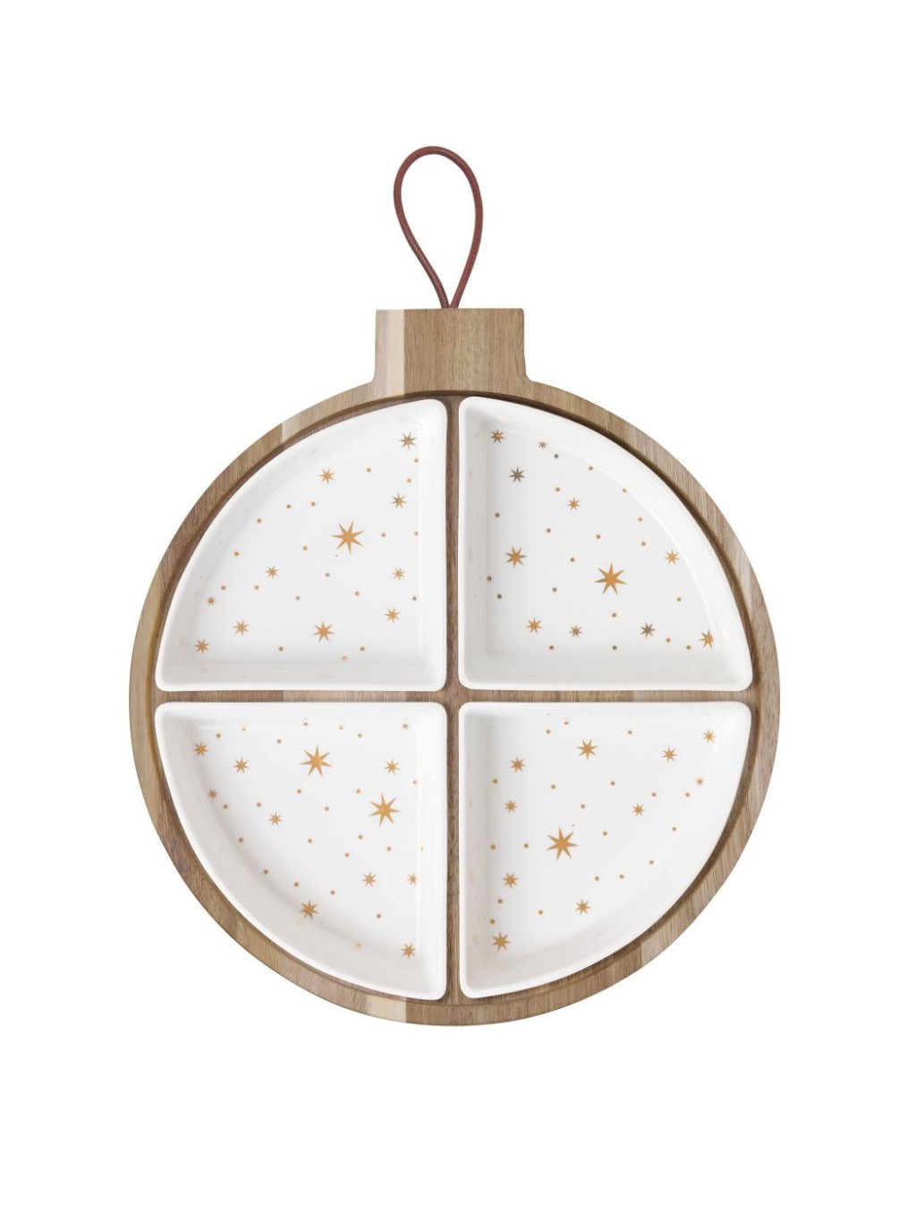 - Praktické a všestranné využití: Čtyři oddělené porcelánové misky nabízejí možnost servírování různých pokrmů – od oříšků a dipů po dezerty nebo sýrové variace.